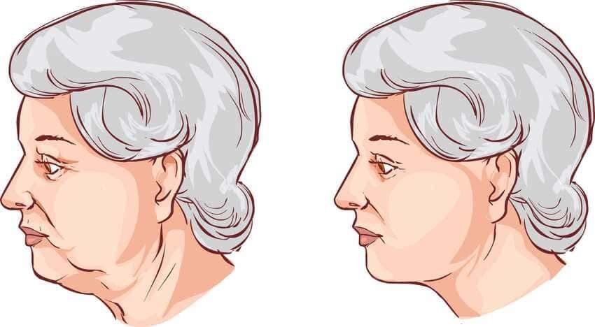 - Relâchement de la peau et excès de graisse au niveau du cou, pouvant se traduire par un double menton ou un « cou de dinde ».